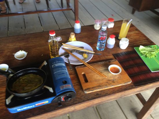 Mit dieser tollen Vorgabe von Nhi und den fleissigen Helfern im Hintergrund macht Kochen richtig Spass. immer wird uns neues sauberes Kochgeschirr bereit gelegt. Alle Zutaten sind schön gerüstet und angerichtet und am Schluss wird alles wieder weggeräumt. Wir gehen mit Mörser, Kochsticks und kleinen Pfannen schon sehr professionell um. Möchte gar nicht wissen, wie viel Geschirr wir in diesen beiden Stunden gebraucht haben. Das Ergebnis ist aber sensationell. Ausserdem werden unsere Gläser laufend mit einem kühlen verdünnten Fruchtsaft aufgefüllt.