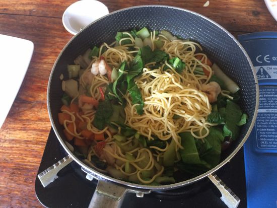 Und dann zum Hauptgang. Gebratener Nudeln mit Crevetten und viel Gemüse.