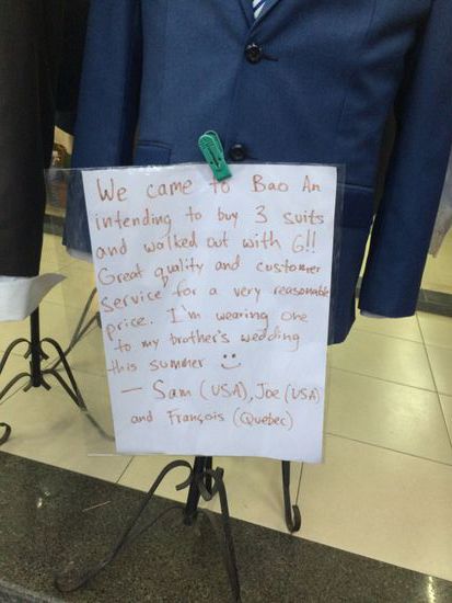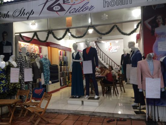 Hoi An, bekannt für seine vielen Schneidereien. Eigentlich sollte man sich hier Masskleider machen lassen. Ich habe weder Bedarf noch Lust dazu, finde es aber spannend, dass sich hier auf kleinem Terrain eine solche 'Industrie' entwickelt hat. Jedes zweite Haus ist eine Schneiderei. Vor dem Laden stehen die Puppen mit den verschiedensten Kleidern. Die Empfehlungen von Kunden aus aller Welt sind daran angeheftet.