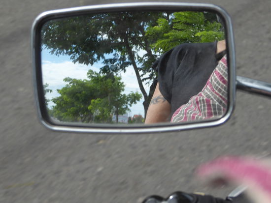 Ich sitze schon ganz entspannt auf dem Sozius, wenn nur diese Kurven nicht wären. Ich weiss nie, auf welche Seite er abzweigen wird, er fährt die engen Kurven aber ganz langsam, so wie er auch überhaupt sehr vorsichtig unterwegs ist. Kaum schneller als 30 Km/Std. Das erinnert mich stark an meine Jugend, wo ich mit meinem roten Mofa unterwegs war. Lang ist's her.