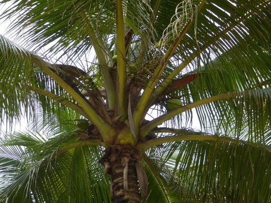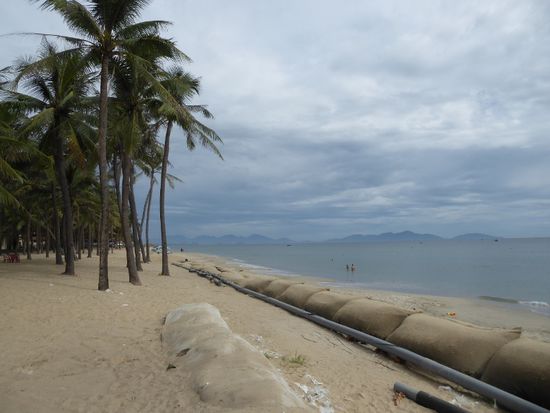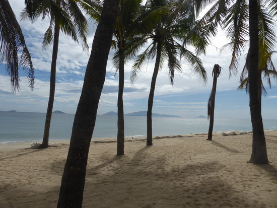 Bald sind wir am Strand. Wunderbarer Sandstrand breitet sich aus. Mit einem breiten Palmengürtel. Weiter vorne sind ein paar Leute im Wasser, es ist warm und ruhig. Weit draussen liegen die vorgelagerten Inseln.
