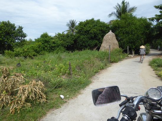 Auch aufsitzen ist nicht so mein Ding, weil er hinter dem Sozius einen Bügel hat. Das ist bequem zum sitzen, aber etwas unpraktisch zum auf- und absteigen. Sonst macht das Mitfahren aber ungemein Spass. Duc fährt nicht auf den Hauptstrassen. Wir nehmen immer wieder schmale Gassen, Feldwege. Es rumpelt manchmal und er weicht Löchern in der Strasse aus. Und erklärt mit den Händen, fährt über Kreuzungen, hupt, wenn er überholt, jedenfalls manchmal und hält an, wenn ich eine Foto machen will.