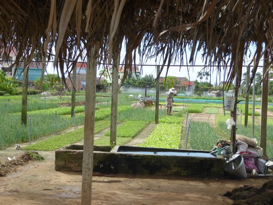 Dann biegt er ein paarmal ab und schon stehen wir in einer riesigen Gemüsepflanzung. Das hier ist Zitronengras, sagt er und reisst ein paar Halme ab. Riech mal. Und dort Salate, Tomaten, Gurken, Zwiebeln, Karotten, dort Sesam, da Koriander. Ich soll riechen und mich ein wenig umsehen. Er werde hier auf mich warten.