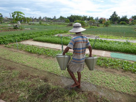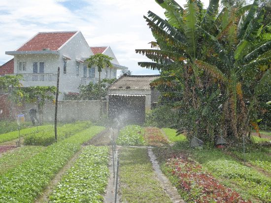 Mit grossen Giess-Kannen giessen die Gärtner ihre Anlagen. Sie holen das Wasser aus Zisternen, die unter schattigen Palmdächern überall in der Plantage angelegt sind. Und dann schreiten sie langsam über die Gartenwege und schwenken ihre Kannen, verteilen ihr Wasser gleichmässig. Das ergibt einen sehr sanften Regen und ein friedliches Bild. Immer wieder Wasser holen, giessen. Eine anstrengende Arbeit, denn die Kannen sind sehr gross und schwer. An einigen Stellen gibt es darum auch bereits elektrische Wasserspeier.