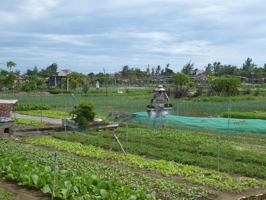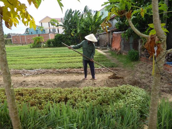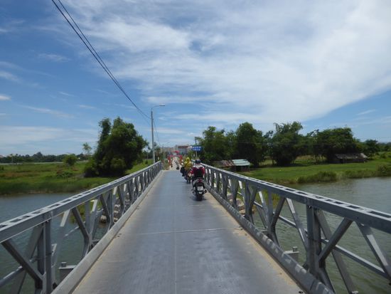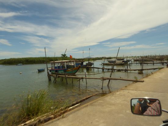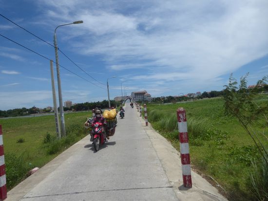 Wir fahren weiter und kommen über eine lange schmale Brücke. Hier dürfen nur Fahrräder und Motorräder fahren, für Autos ist sie zu schmal. Auch diese Brücke steht erst sein einem Jahr, vorher musste man ein Boot nehmen, wenn man auf die andere Seite gelangen wollte. Wir sind jetzt auf der grössten Flussinsel, der Quang Nam Insel.
