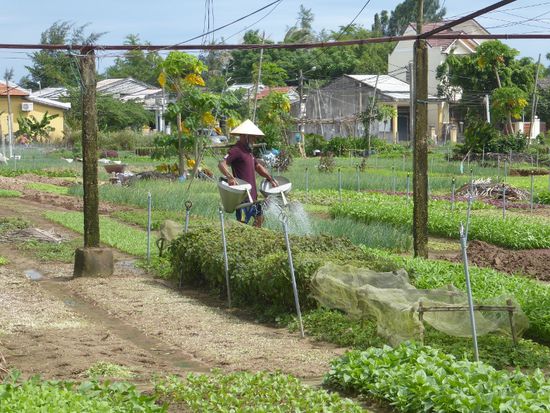 An vielen Orten sind Leute dabei, den Garten vorzubereiten und an einigen Orten wachsen sogar ein paar Blumen. Einige Beete sind mit dünner Folie abgedeckt oder mit Palmwedeln gegen die pralle Sonne geschützt.