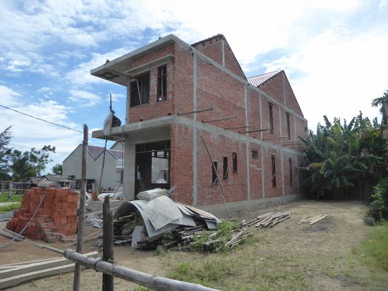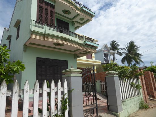 Wir fahren weiter durch die Dörfer und mir fällt auf, dass überall gebaut wird. Überall entstehen neue Häuser, Einfamilienhäuser, manchmal Hotels. Und oft diese eigenartigen schmalen Gebäude. Mir sind die schon auf vielen Fahrten durch Vietnam aufgefallen. Vor allem auf dem Weg zur Halong Bay sah ich viele dieser skurrilen dünnen Gebäude. Skinny hat sie damals eine Sitznachbarin genannt, die wie ich staunend die dünnen Häuser betrachtete, die bis zu vier Stockwerke hoch sein können. Ich habe inzwischen gelesen, dass in Vietnam die Steuern nach der Breite der Fassade des Hauses berechnet wurden. Das scheint tatsächlich noch heute der Fall zu sein. Habe vergessen Duc danach zu fragen.