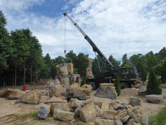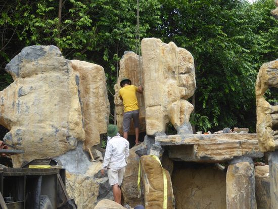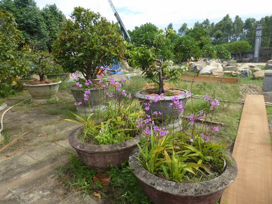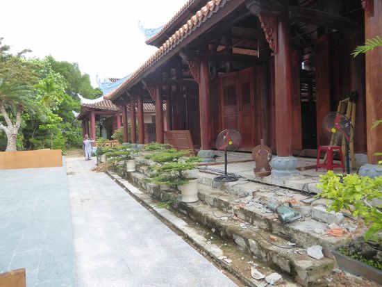 Leider werden die Gebäude grad umgebaut und überall stehen Geräte, lärmen Maschinen, so dass von der sicher sehr schönen Anlage nicht sehr viel zu sehen ist. Es gibt ganz viele Bonsais, die aber alle an einer Stelle stehen, weil sie sonst den Bauarbeitern in den Weg kämen. Ich beobachte eine Zeitlang, wie ein schwerer Stein mit einer Baumaschine auf einen anderen gesetzt wird. Ein Arbeiter gibt dem Maschinisten Anweisungen und ein anderer hält den Stein, der noch aufgehängt ist und schiebt ihn sanft an den richtigen Ort, wo er dann definitiv gesetzt wird. Ich sehe auf seine Füsse. Er steckt in FlipFlops, was denn sonst.