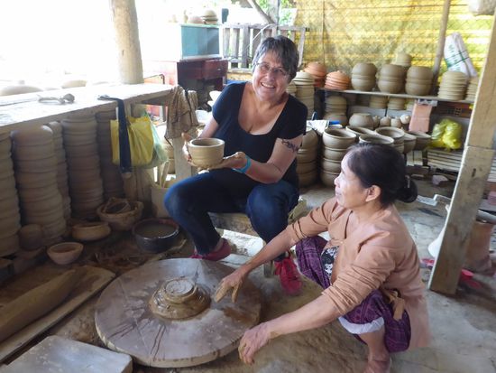 Duc will mir das Töpferdorf zeigen. In allen Häusern wird getöpfert und die Frau, bei der wir einkehren, zeigt mir zuerst wie sie das macht. Sie sitzt auf einem niederen Sitz und formt ihre Gefässe mit den Händen. Angetrieben wird die Töpferscheibe von ihrer Tochter, die sie mit den Füssen dreht. So entstehen harmonische schöne Formen, Gefässe aus Ton, der unten am Fluss geholt wird.