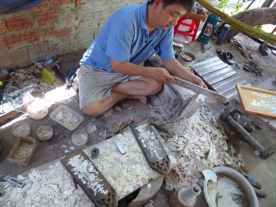 Im nächsten Haus sind es Einlegearbeiten. Mit dünnen Muschelstückchen werden ganze Muster aufgezeichnet. Der Mann schneidet die feinen Stücke zu, schleift ein zu dickes Muschelplättchen und legt es auf das Holz. Und wie kommt es in das Holz, wie schafft er es, dass sich Holz und Muschel auf der gleichen Höhe treffen? Ich kann nichts fragen.