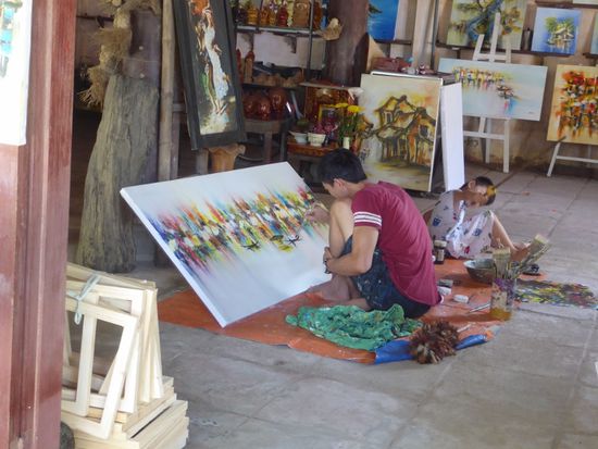In einem Laden entdecke ich einen jungen Künstler am Malen. Inzwischen geht es gegen Mittag, wir fahren zurück. Wieder über die lange Metallbrücke, zurück in die Stadt. Es ist Mittag und es wird wieder sehr heiss werden. Schon jetzt sind es 32 Grad.