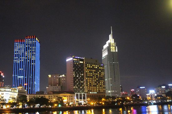Das Gebäude in der Mitte mit er Helikopterplattform ist zur Zeit das höchste hier in Saigon: Bitexco Financial Tower 258,5 m.