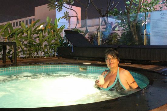 Zurück im Hotel steige ich hinauf zum Pool. Der ist jetzt geschlossen, denn es ist kurz nach 22.00 Uhr. Aber der Whirlpool ist noch offen und so findet man mich schon bald da. Ob er mir eine Foto machen könnte, frage ich den Kellner, der mit meine Pinacolada bringt. Ja sehr gern. Er hört gar nicht mehr auf, zu fotografieren. I like that, sagt er und fokuissiert mich von allen Seiten. Mir ist nicht ganz klar, was er daran so mag, ob er gern ältere Damen fotografiert oder ob ihn meine Kamera fasziniert.