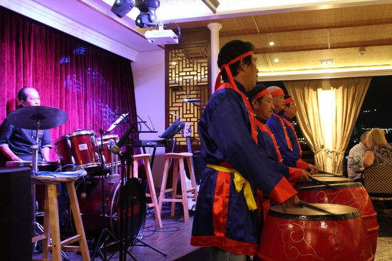 Bald wird das Buffet eröffnet, ich bekomme mein Glas Wein und die Musik beginnt mit eindrücklichen Trommelklängen.