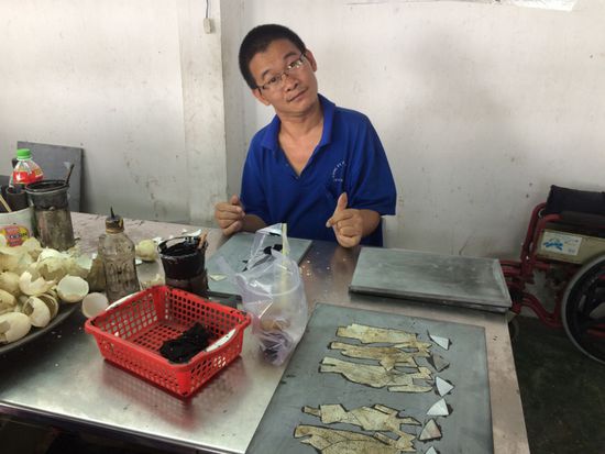 Eine junge Vietnamesin zeigt und erklärt, wie die Einlegearbeiten entstehen. Die Zeichnungen werden ins Holz graviert, dann mit Muschelstücken oder anderen Materialien, wie Eierschalen ausgefüllt, koloriert, lackiert, gewaschen und poliert. Es entstehen wunderschöne Arbeiten. Alles in Handarbeit.