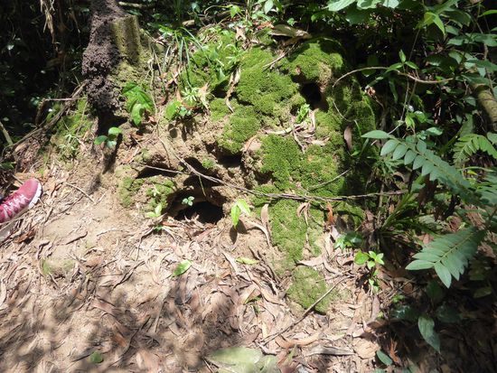 Ein Brett im Boden, kaum sichtbar unter Laub versteckt. Durch ein solches Loch konnten Kämpfer jederzeit auftauchen und wieder verschwinden. Ein Termitenhügel, nichts besonderes. Das war ein Lüftungssystem. Man hat Bambusrohre in die Erde gelegt, die Termiten haben die Rohre gefressen, die Löcher blieben. Völlig unsichtbar.