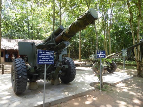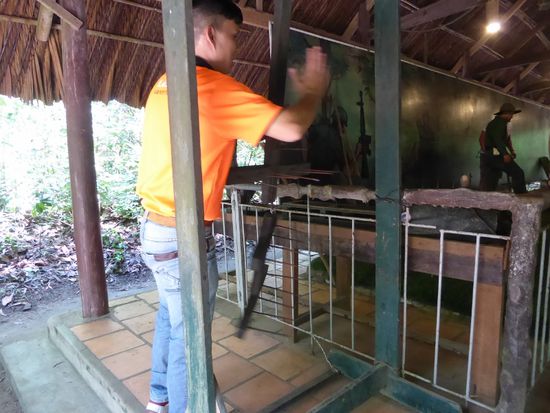 Durch einen Tunnel erreichen wir das Gelände, das für Touristen und Einheimische präpariert wurde. Es ist ein Freilichtmuseum, aber auch ein Schnell-Lehrgang in Guerillakampf.