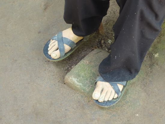 Doch diese hatten auch dagegen einen Trick. Sie trugen Sandalen mit verkehrten Sohlen. So hinterliessen sie Spuren, die in die falsche Richtung zeigten. Ho-Chi-Minh-Sandalen nannte man sie. Die Sandalen der Kämpfer. In einer kleinen Werkstatt können wir sehen, wie sie aus Autoreifen und Schläuchen hergestellt werden.
