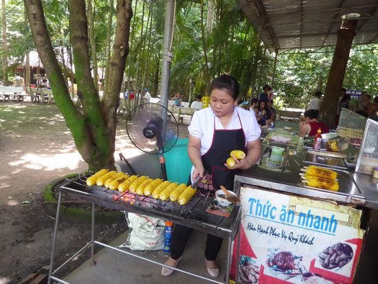 Nan verteilt Wasser, reisst ein paar Witze und erzählt was wir heute vorhaben. Die Fahrt ins ca 70 km entfernte Cu Chi dauert knapp zwei Stunden. Auf halber Strecke halten wir bei einem Laden an, wo Überlebende und Opfer der Giftangriffe mit Agent Orange in einem grossen Verkaufslokal ihre Kunsthandwerke anbieten.