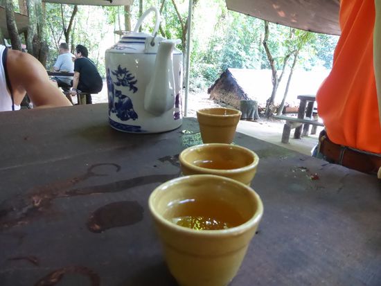 Zum Abschluss setzen wir uns alle zusammen an einen Tisch. Es gibt heissen Tee und gekochten Maniok zum Probieren. Nan zeigt uns eine Pflanze. eigentlich ist es ein kleiner dünner Baum. Gegessen werden die Knollen, die ähnlich wie Kartoffeln schmecken und auch so gekocht werden.