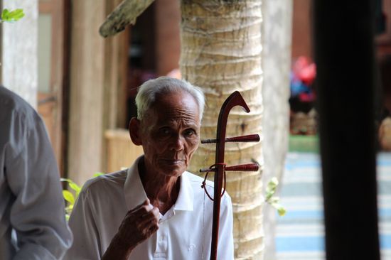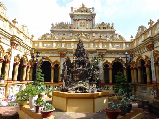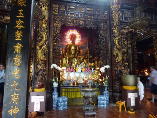 Nach dem Essen fahren wir mit dem Schiff zurück in die Stadt und besuchen die älteste Pagode des Mekong-Deltas.