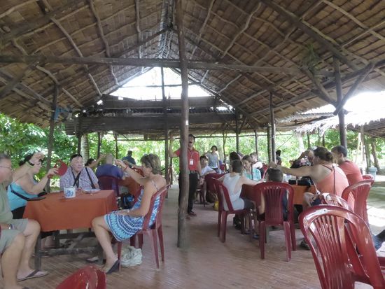 Diesmal werden wir von einem Motorboot erwartet. Wir fahren auf die nächste Insel wo wir in einem grossen Obstgarten zum Mittagessen eingeladen werden.