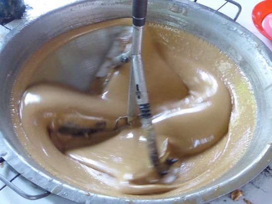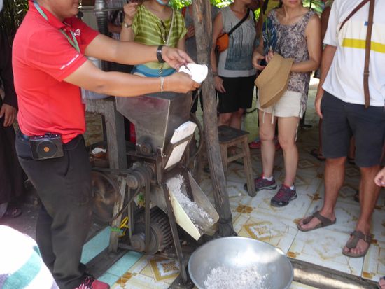 Die geraspelten Kokosnüsse werden gepresst und der Saft daraus ist die Kokosnussmilch, die dann eingekocht und eingedickt wird, bis sich eine feste Masse bildet, die getrocknet, geschnitten und abgepackt wird. Eine sehr einfache Fabrikation. Herstellung und Geschmack erinnert an Caramel. Auch hier gibt es einen einfachen Verkaufsstand für Caramel und schöne Holzarbeiten aus Kokosnussholz.