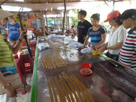 Auf der nächsten Insel erwartet uns eine Demonstration, wie Kokosnussbonbon hergestellt werden. Dazu werden die Kokosnüsse geöffnet und das weisse Fleisch herausgeschält. Den Saft kann man nicht nutzen, es muss eine andere Art sein, als die, die ich bei jeder Gelegenheit trinke.