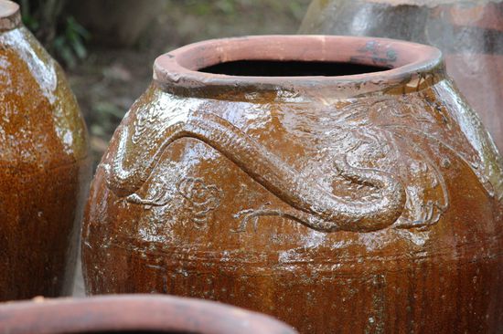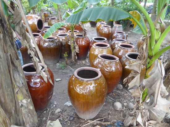 Nach einem kurzen Spaziergang erreichen wir einen Ort wo Tontöpfe verkauft werden. Hier werden wir nicht zu einem Kauf animiert, MT erzählt uns nur, dass in diesen Töpfen Regenwasser als Trinkwasser gesammelt wurde, bevor es in der Gegend fliesssend Wasser gab. Auch heute noch werden diese Töpfe vielerorts dafür benutzt, denn die Wasserversorgung hat noch längst nicht alle Bereiche erreicht.