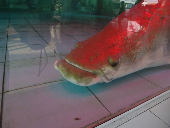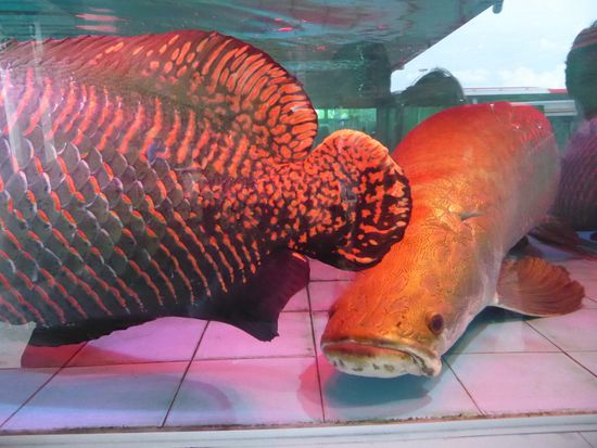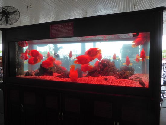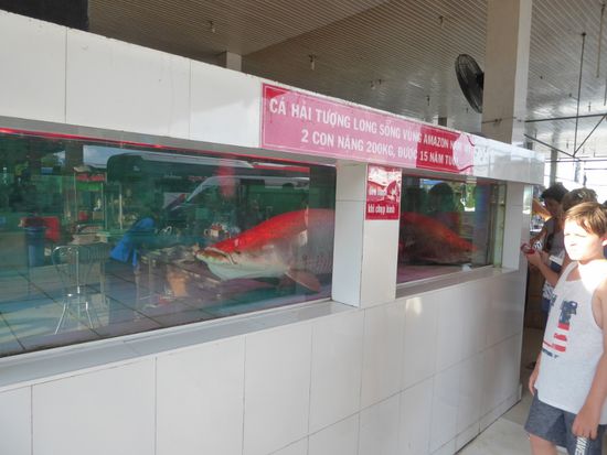 Und wie immer gibt es auch hier auf halber Strecke einen Halt an einer Raststätte. Diese wartet mit einer besonderen Attraktion auf. In einem viel zu kleinen Bassin schwimmen zwei Fische. Zwei riesige Fische. Fast zwei Meter lang. Riesendinger. Ich kann nicht herausfinden, was für Fische das sind, vermute aber, dass mindestens einer ein Wels ist.
