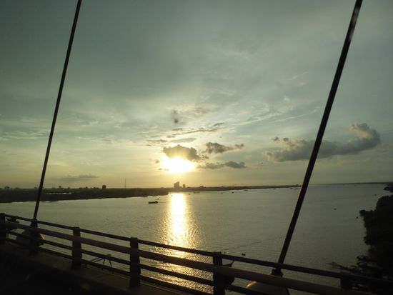 Bald sind wir wieder unterwegs. Wir fahren über eine lange Brücke, die den Mekong überspannt. Sie wurde erst vor acht Jahren eingeweiht, vorher gab es hier einen Fährbetrieb über den der ganze Verkehr abgewickelt wurde. Fast nicht vorstellbar, wie das funktioniert hat. Wahrscheinlich ist der Verkehr seit die Brücke steht, ständig angewachsen.