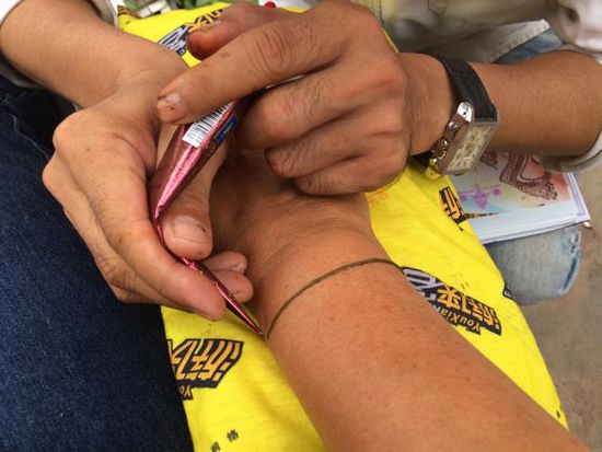 Nachdem die Zeichnung fertig ist, muss ich sie noch eine Weile unter den Ventilator halten. Die Paste muss erst komplett austrocknen. Eine Stunde soll ich es jetzt so lassen, dann kann ich sie wegkratzen. Das Tattoo wird ungefähr 10 Tage bleiben.
