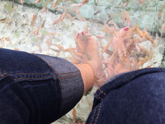 Ganz schön kribbelig. Zuerst will die die Füsse gleich wieder aus dem Wasser ziehen, doch mit der Zeit finde ich das ganz lustig und später spüre ich es fast nicht mehr. Da ich mir grad vorhin die Hornhaut wegrubbeln liess, sind sie vielleicht auch etwas weniger beschäftigt. Sie knabbern allerdings nicht nur an den Fusssolen, sondern behandeln die ganzen Füsse.
