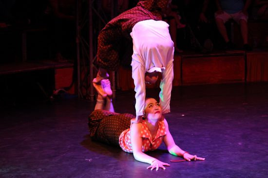 Wäsche waschen und mit den Tüchern zaubern, Purzelbäume schlagen und ins Zeltdach geschleudert werden. Sie wirbeln durch die Luft und am Boden und tanzen an schwingenden Stangen. Es ist alles drin in dieser Show und den jungen Künstlern gelingt es auch immer wieder, mit dem Publikum zu flirten.