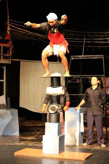 Gleich gleich, aber anders, das ist das Motto der Zirkusaufführung und die grösste Differenz zeigt sich gleich von Anfang an. Die Artisten treten in normalen Strassenkleidern auf. Da ist gar nichts von Glamour und Glitzer wie man es vom Zirkus gewohnt ist. Aber ganz viel Können auf höchstem Niveau, ganz viel Spass, Komik, Tempo. Jeder ist ein Akrobat und Schauspieler. Es wird getanzt, gehüpft, gesprungen, jongliert und an den Seilen und Stangen, die vom Zeltdach herunterkommen, geturnt.