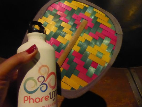 Die wieder-auffüllbare Wasserflasche wurde am Anfang als Geschenk verteilt, den Fächer muss ich am Schluss wieder abgeben, aber er hat mir sehr geholfen. Im Zelt gibt es zwar grosse Kühlgeräte, aber die Leistung der Artisten bei diesen hohen Temperaturen ist erst recht grossartig.
