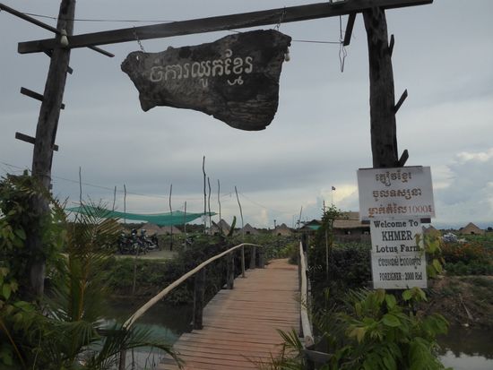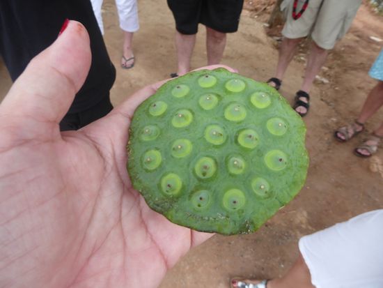Zuerst besuchen wir allerdings eine Lotusfarm. Sam, unser Guide erzählt, dass die Lotusblume nicht nur für Buddha im Tempel gebraucht wird, sondern, dass auch die Wurzeln und Früchte gegessen werden können. Dazu reisst er eine Pflanze mitsamt der langen Wurzel aus, diese sieht wie die weisse Verlängerung des grünen Stengels aus.