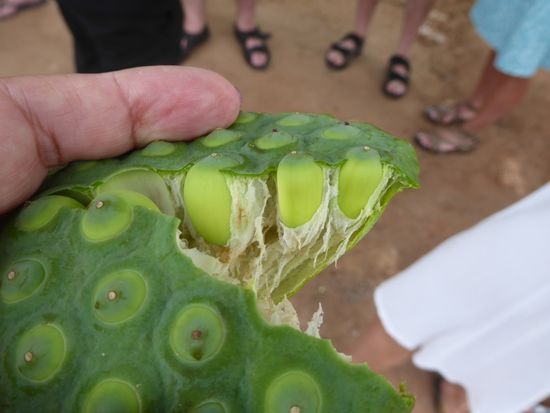 Der Bus fährt weiter und wir pulen immer noch Lotussamen aus den Kapseln. Schon bald erreichen wir den See. Wir werden von unserem Schiff erwartet und fahren bald schon los.