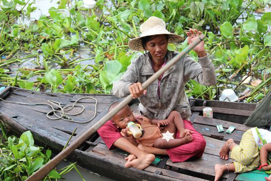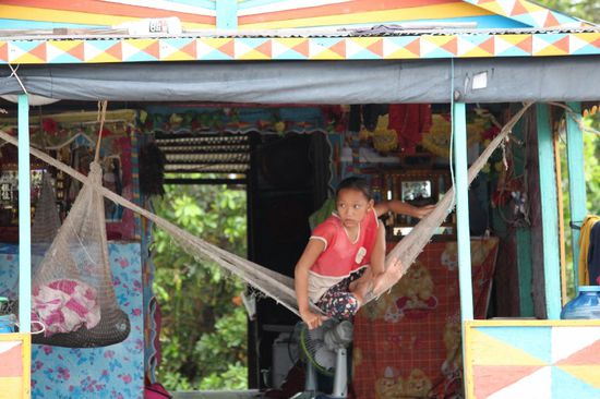 Eine Frau bettelt um Geld und zeigt mir ihren fast nackten Säugling. Essen, scheint sie zu sagen. Was soll ich machen? Das sind die Momente, die extrem schwierig sind. Sie sitzt da unten in ihrem kleinen Boot, ich da oben auf den Planken des Shops.