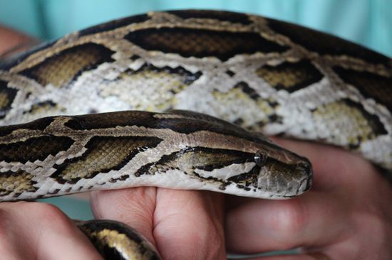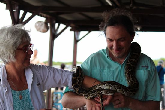 Wir legen an. Am schwimmenden Souvenirladen. Und bei der Krokodilfarm. Begrüsst werden wir von zwei Frauen, die gegen ein Trinkgeld ihre Schlange aus dem Kasten holen und einem Passagier um den Hals hängen. Er kann zum Glück gut damit umgehen und auch seine Frau findet langsam Gefallen an dem Tier und staunt, dass es nicht feucht ist.