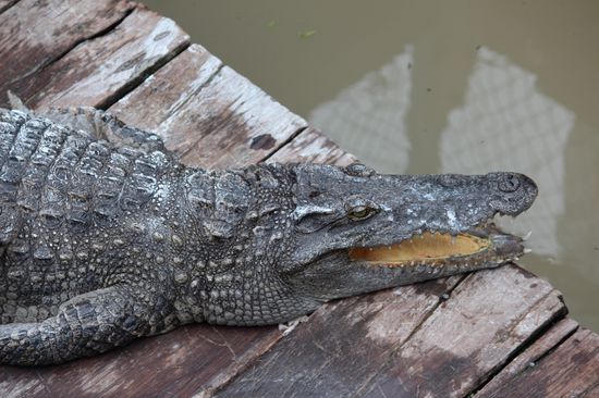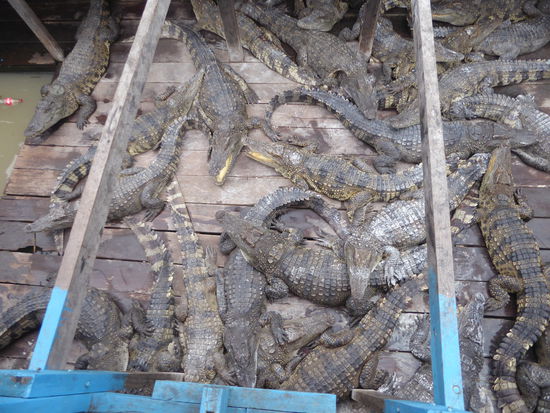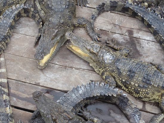 Die Krokodile leben in einem kleinen Gehege mit Wasserzugang. Natürlich ist das Gehege auch unter Wasser gesichert. Es stinkt fürchterlich. Wofür werden sie gehalten, will ich wissen. Vor allem für die Haut, da drüben kann man Produkte aus Krokodilleder und Schlangenhaut kaufen. Und auch für das Fleisch, aber das ist nicht sehr kostbar. Wichtiger ist das Leder.