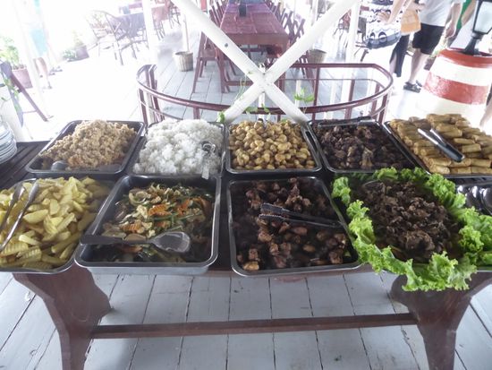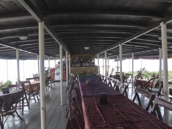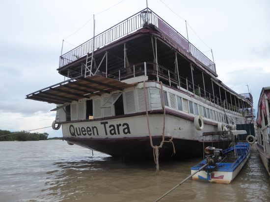 Wir legen wieder ab und erreichen bald die Tara Queen. Laut Beschreibung das grösste Schiff in der Gegend. Es mutet mich fast wie ein Seeräuberschiff an. Im oberen Stock sind die Tische gedeckt und ein kleines Buffet steht bereit.