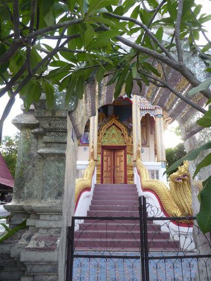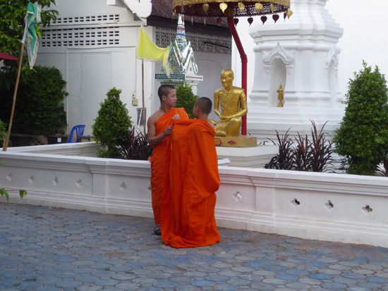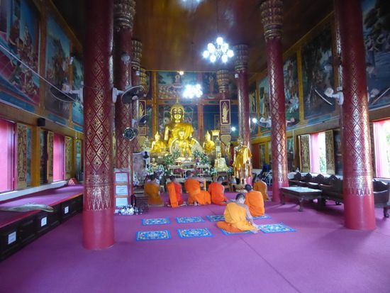 Am späteren Nachmittag mache ich mich auf, die neue Umgebung zu erkunden. Und stelle fest, dass ich wieder einmal von Tempeln umgeben sind. Mindestens drei sind es, die ich in unmittelbarer Nähe finde. In einer versammeln sich die gerade die Mönche. Nach und nach treffen alle ein, knien auf die für sie ausgelegten Teppiche und stimmen ein singendes Gebet ein. Der älteste Mönch scheint der Vorbeter zu sein, die Jungen stimmen mit ein. Es sind zum Teil Buben, die da hocken. Ich würde gern etwas mehr wissen, über das Leben als Mönch.
