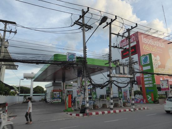 Ich schlendere weiter. Komme an einer Tankstelle vorbei und bewundere wieder einmal die unglaublichen elektrischen Installationen. Oben sind die Stromleitungen und unten die Telefonkabel. Louis hat mir in Bangkok erklärt, dass vielfach ganz oben noch die Starkstromleitung durchführt, hier scheint das nicht der Fall zu sein. Ist aber trotzdem sehr eindrücklich.