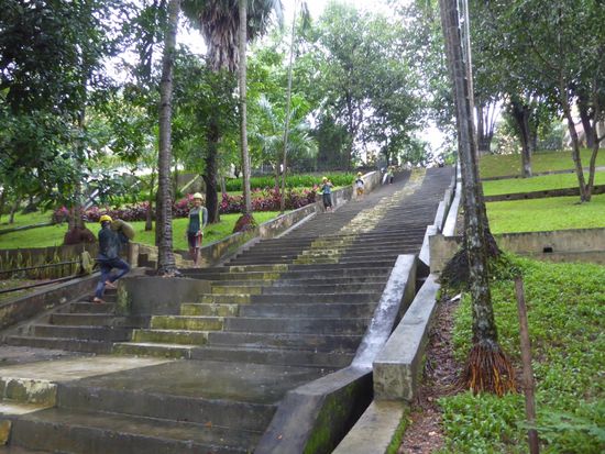 Eine lange Treppe führt hinauf, aber der Taxifahrer meint, ich solle dort rechts durch den Durchgang gehen. Ich weiss zwar nicht, warum ich nicht die Treppe hinauf steigen soll, sie sieht nicht abgesperrt aus, auch wenn ein paar Männer schwere Sandsäcke hinauf tragen. Immer ein paar Stufen hoch, dann wird die Last an den nächsten übergeben und weiter getragen, dorthin wo der nächste Posten übernimmt.