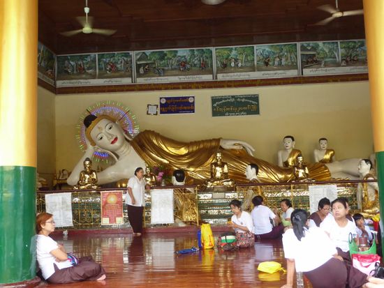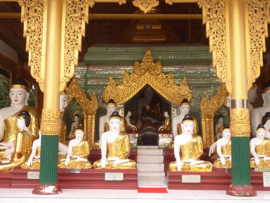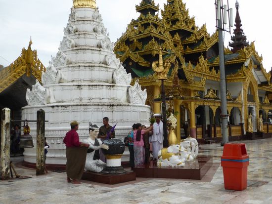 Schau da drüben, da bringen die Leute Goldplättchen. Sie kleben sie auf die Statue. Hinter uns, dort draussen im Pavillon kann man sie kaufen. Ganz dünne Plättchen, die auf der Statue kleben. Du kannst das Gold auch essen, es ist so dünn, oder auf deine Haut auftragen.