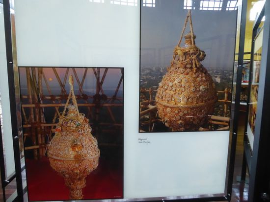 Und in der Spitze, ganz oben in der Pagode, sitzt ein 76-karätiger Diamant auf einer Goldkugel von 25 cm Durchmesser mit 4000 Diamanten. Jeden Tag laufen Diener um die Pagode und sammeln das Gold und die Edelsteine auf, die in der Nacht von oben herunter gefallen sind, bringen es zurück in die Pagode..