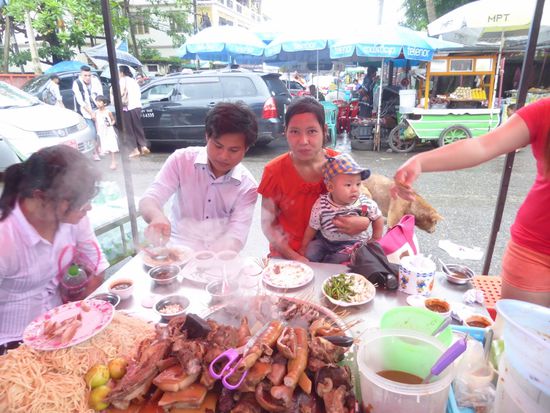 Es gibt aber auch Essensstände. Die chinesischen zum Beispiel. Da wird Schweinefleisch auf Spiesschen angeboten. In der Mitte des kleinen Imbisstandes kocht eine dampfende Brühe.