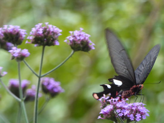 Wir lassen uns nicht entmutigen, folgen dem Pfad und schon bald zieht mich ein ungewöhnlicher Falter in Bann. Wahrscheinlich ist es ein Schmetterling, aber seine Flugtechnik ist sehr speziell. Nur die grossen oberen Flügel flattern aufgeregt, fast wie ein Vogel, während die unteren langen Flügel fast bewegungslos sind. Es braucht einige Geduld, bis ich ihn auf die Foto bannen kann.