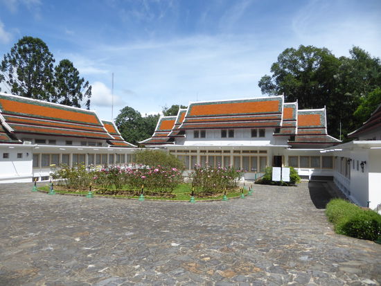 Der Park ist vor allem ein Rosengarten und bei der weiteren Lektüre des Planes entdecke ich, dass es sich um einen königlichen Palast handelt. In die Gebäude darf man nicht, dafür lädt ein Schild bei einem pavillonartigen Haus ein, sich im Kondolenzbuch von König Bumibol zu einzutragen.